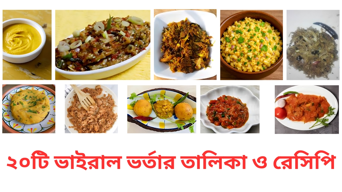 বাংলাদেশি খাবারের অন্যতম গুরুত্বপূর্ণ অংশ হলো ভর্তা। ভাতের সঙ্গে খেলে স্বাদ বাড়ায় এবং পুষ্টিকর। এই পোস্টে আমরা জানব ২০টি জনপ্রিয় ভর্তা, তাদের রেসিপি, পুষ্টিগুণ, খাওয়ার উপযোগিতা এবং সংক্ষিপ্ত বর্ণনা।